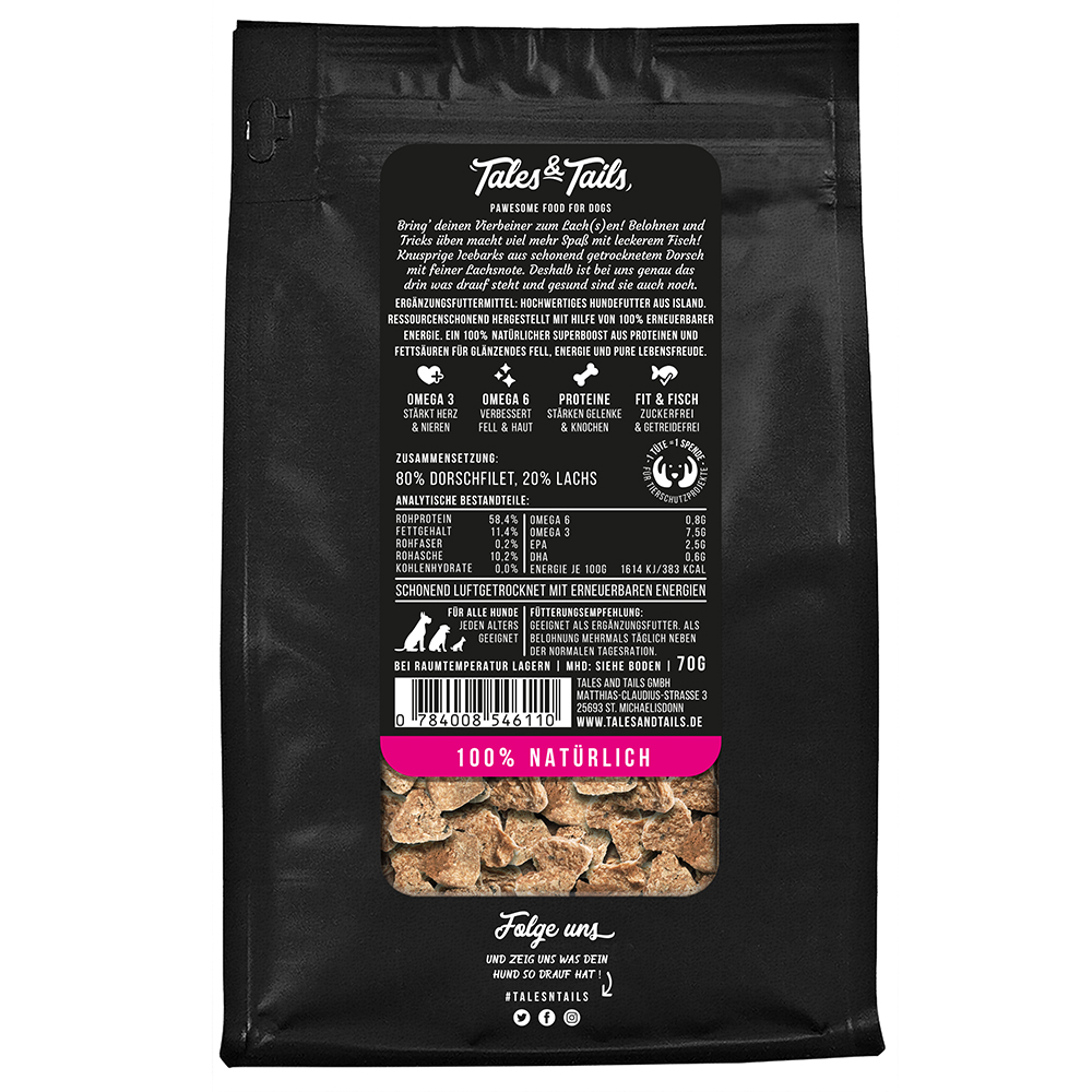 Bring deinen Hund zum Lach(s)en! Belohnen und Tricks üben macht viel mehr Spaß mit leckerem Fisch! Knusprige Icebarks aus schonend getrocknetem Dorsch mit feiner Lachsnote. Mit viel Omega 6 und Omega 3 Fettsäuren.