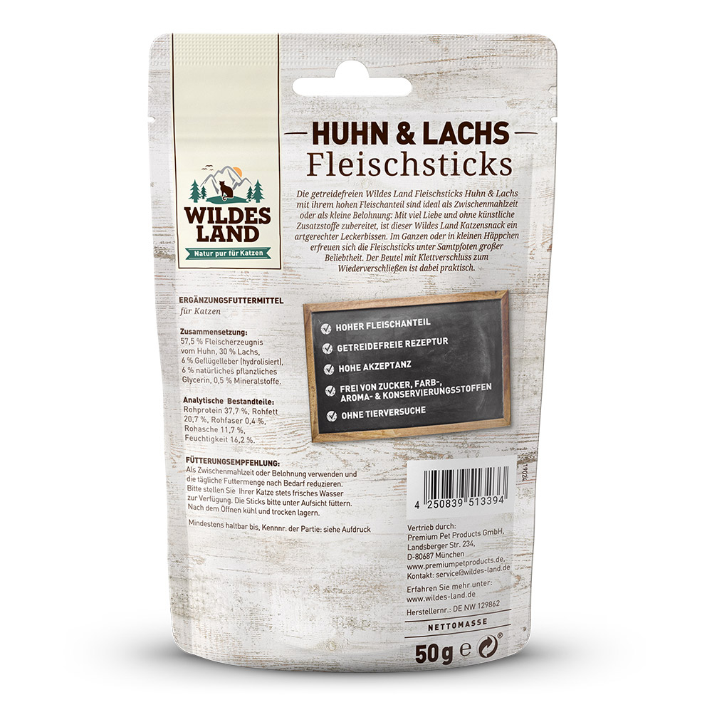Entdecken Sie mit den feinen Fleischsticks Huhn&Lachs von Wildes Land einen natürlichen und gesunden Leckerbissen für Katzen.