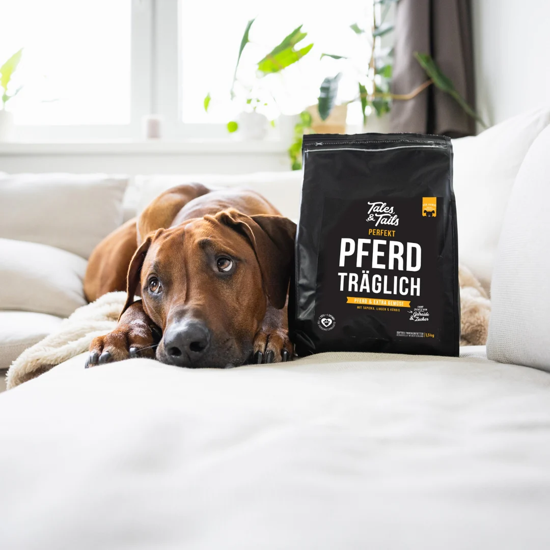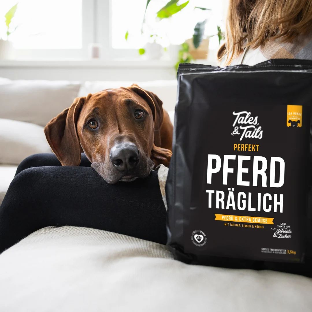 Bei diesem Futter gehen gleich die Pferde mit deinem Hund durch! Das softe Trockenfutter für Hunde von Tales&Tails ist nicht nur besonders lecker und schonend zubereitet, sondern auch noch besonders gut verträglich dank hypoallergenem Pferdefleisch als Monoprotein mit nur sechs weiteren hochwertigen Zutaten.