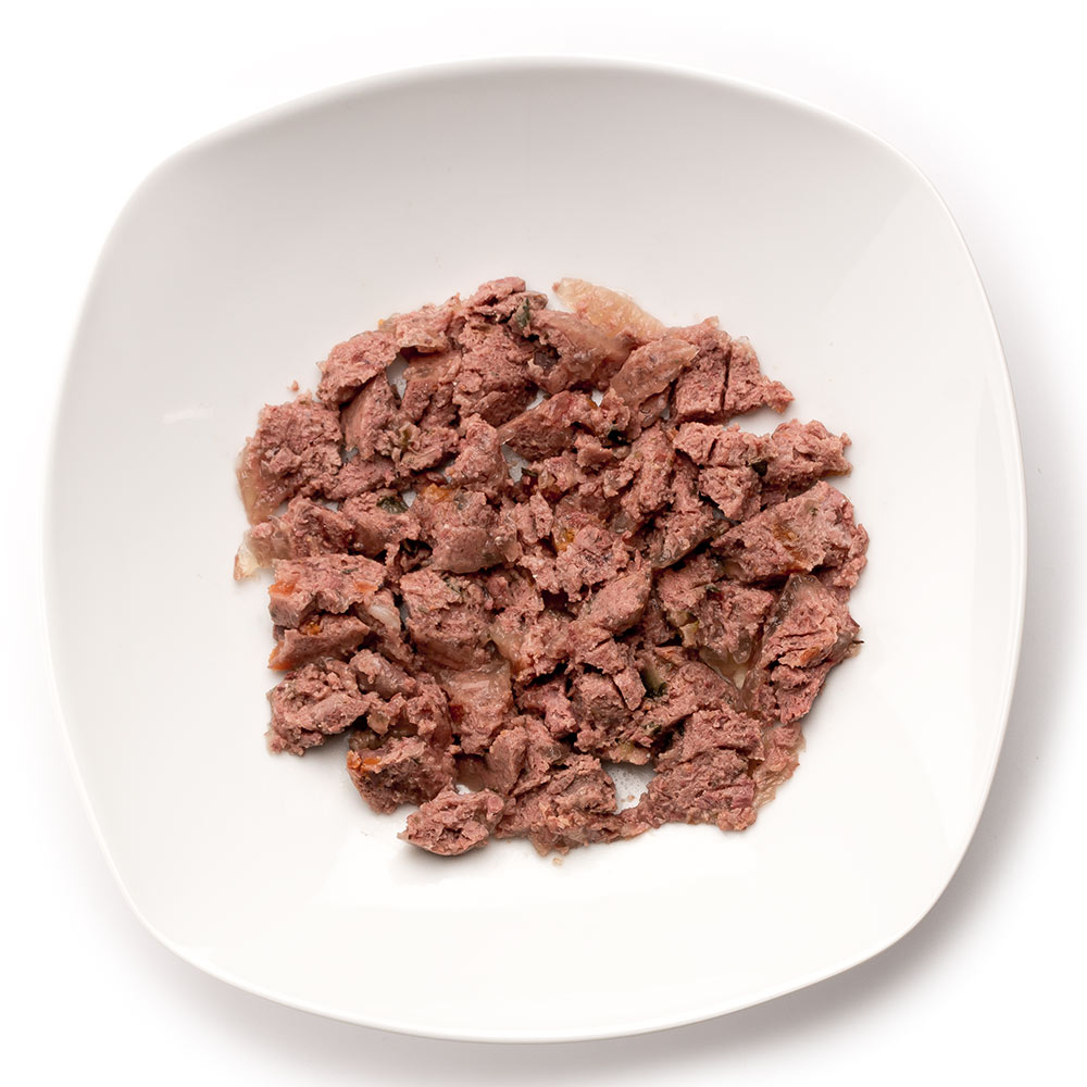 Huhn 62% (Herz, Fleisch, Leber, Mägen, Hälse), Brühe 27,5%, Karotten 4%, Zucchini 3%, Preiselbeeren 2%, Mineralstoffe 1%, Distelöl 0,3%, Kräutermischung 0,1% (Basilikum, Kamille, Löwenzahn, Petersilie, Rosmarin), Yucca-Extrakt 0,1%