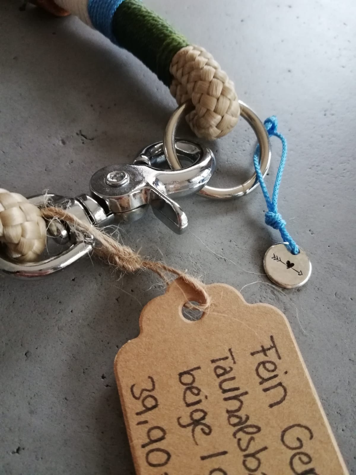 Das Tau-Halsband ist 10mm stark, 3-farbig getakelt und hat einen kleinen Anhänger.