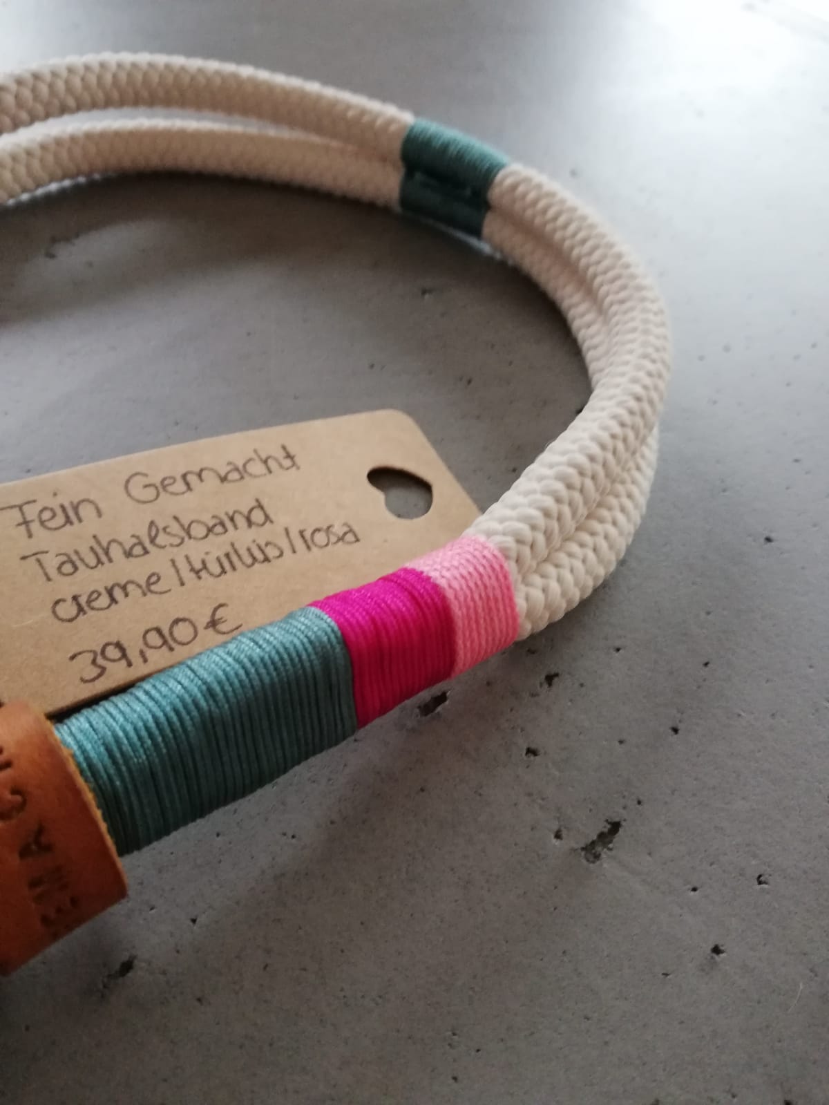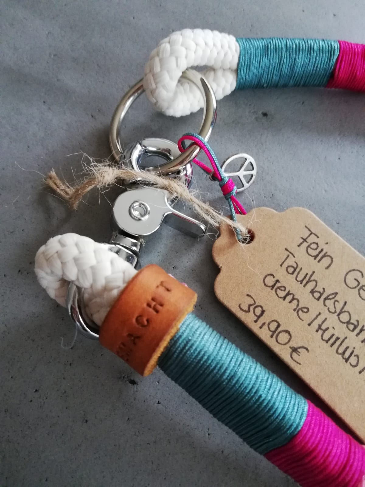 Das Tau-Halsband ist 10mm stark, 3-farbig getakelt und hat einen kleinen Anhänger.