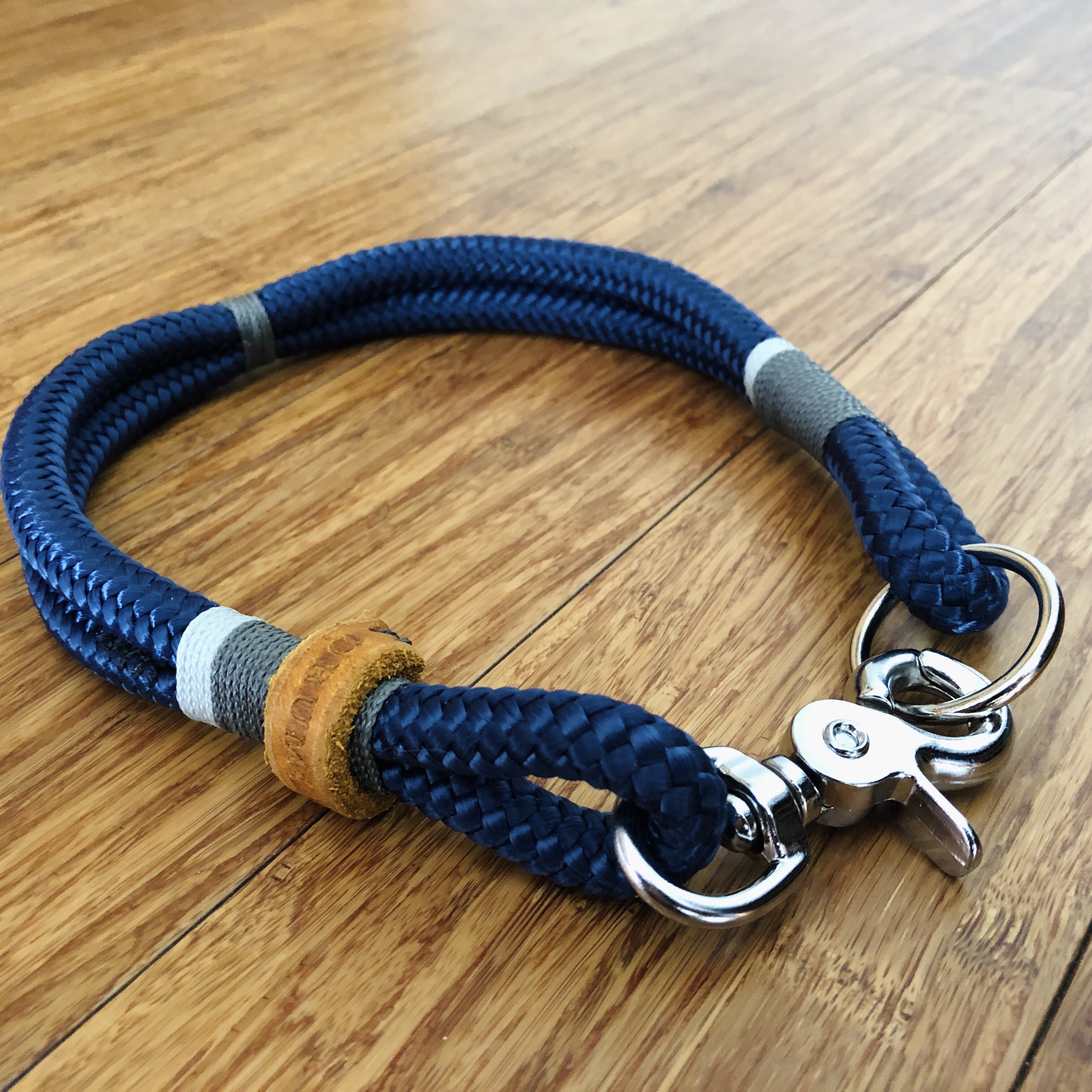 Das dunkelblaue Tau-Halsband "PEACE" von DRUM&DRAN ist 10mm stark, 2-farbig in silber und grau getakelt und hat einen kleinen Peace-Anhänger.