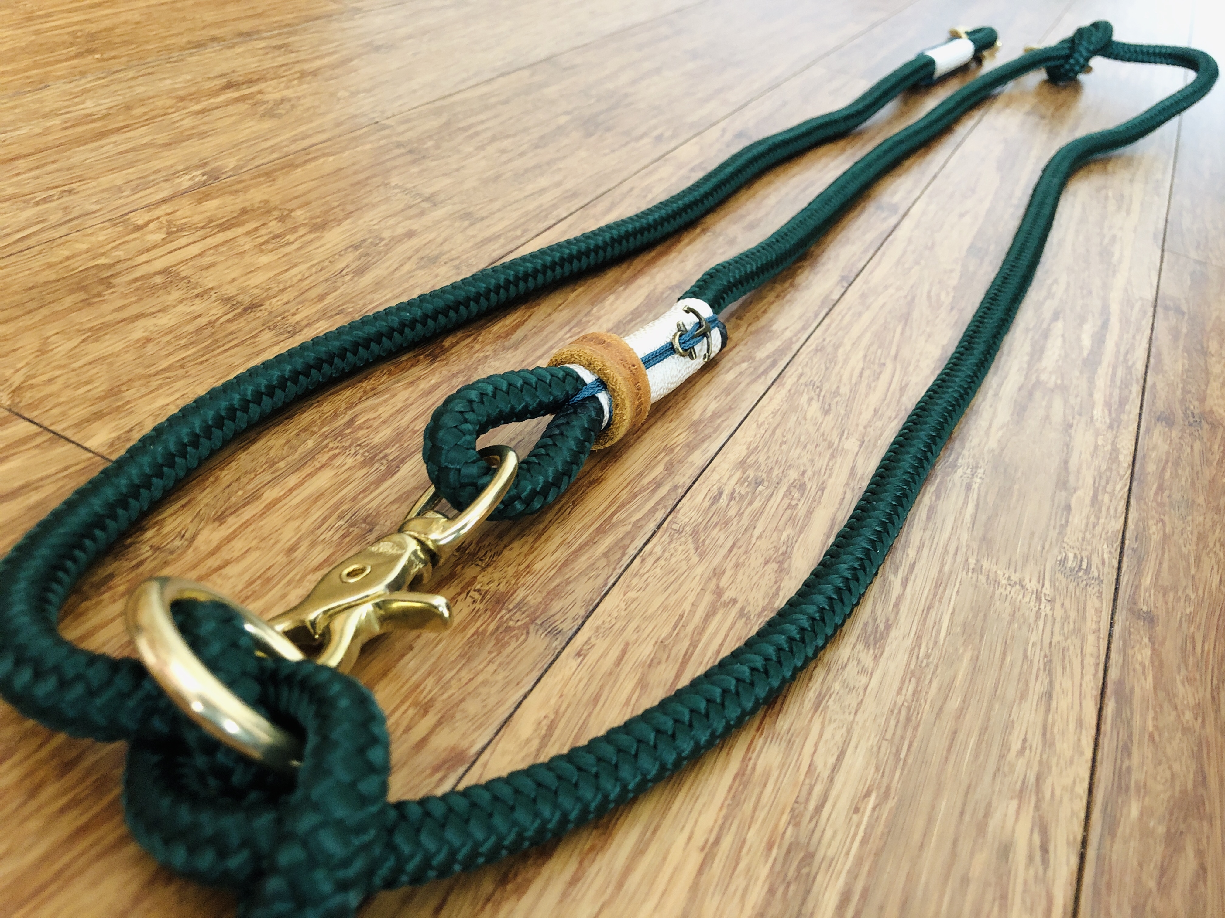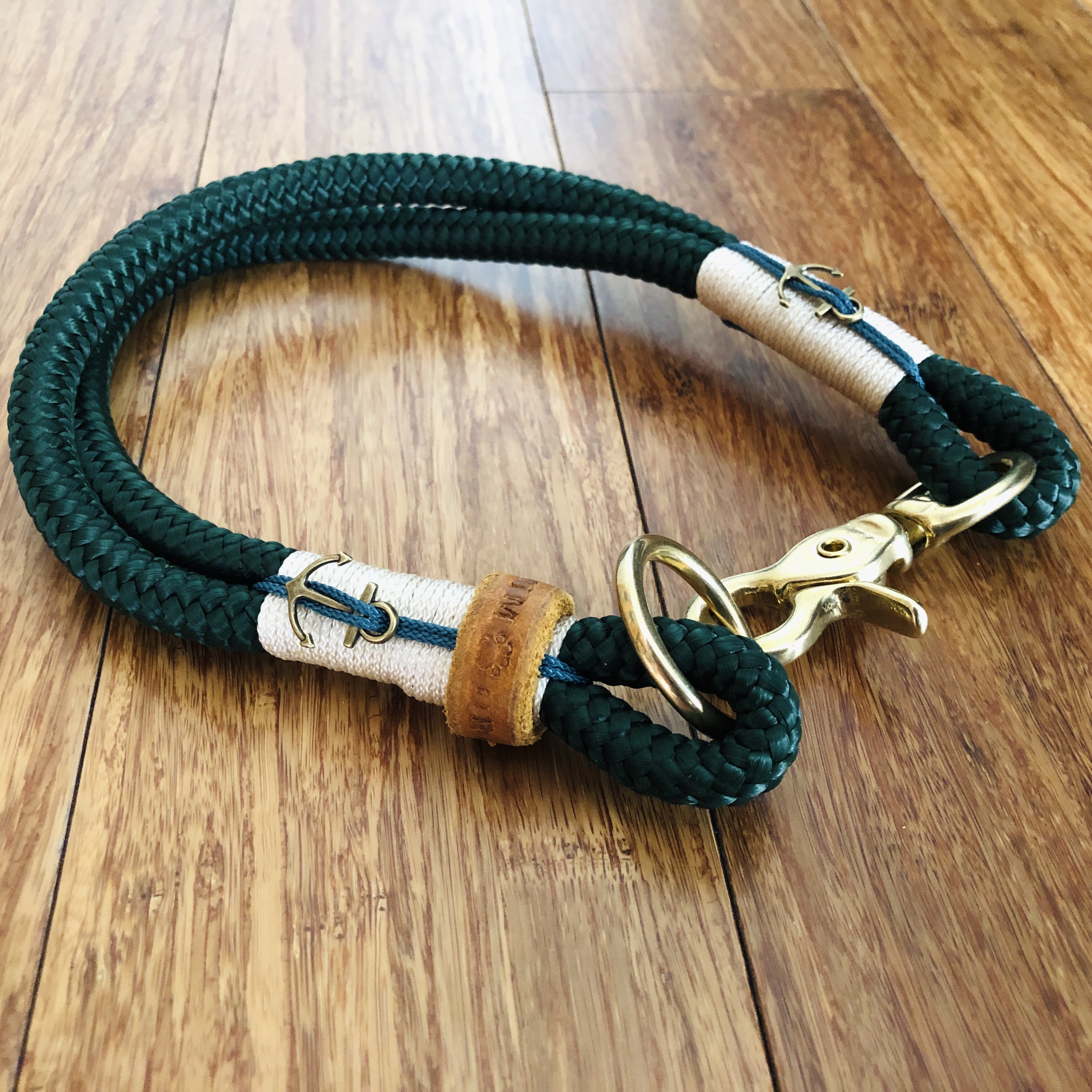 Das Tauleinen-Set für Hunde besteht aus einer 10 mm starken dunkelgrünen PPM- Seilleine mit passendem Halsband und einer creamfarbenen Takelung mit schönen Ankern als Blickfang.
