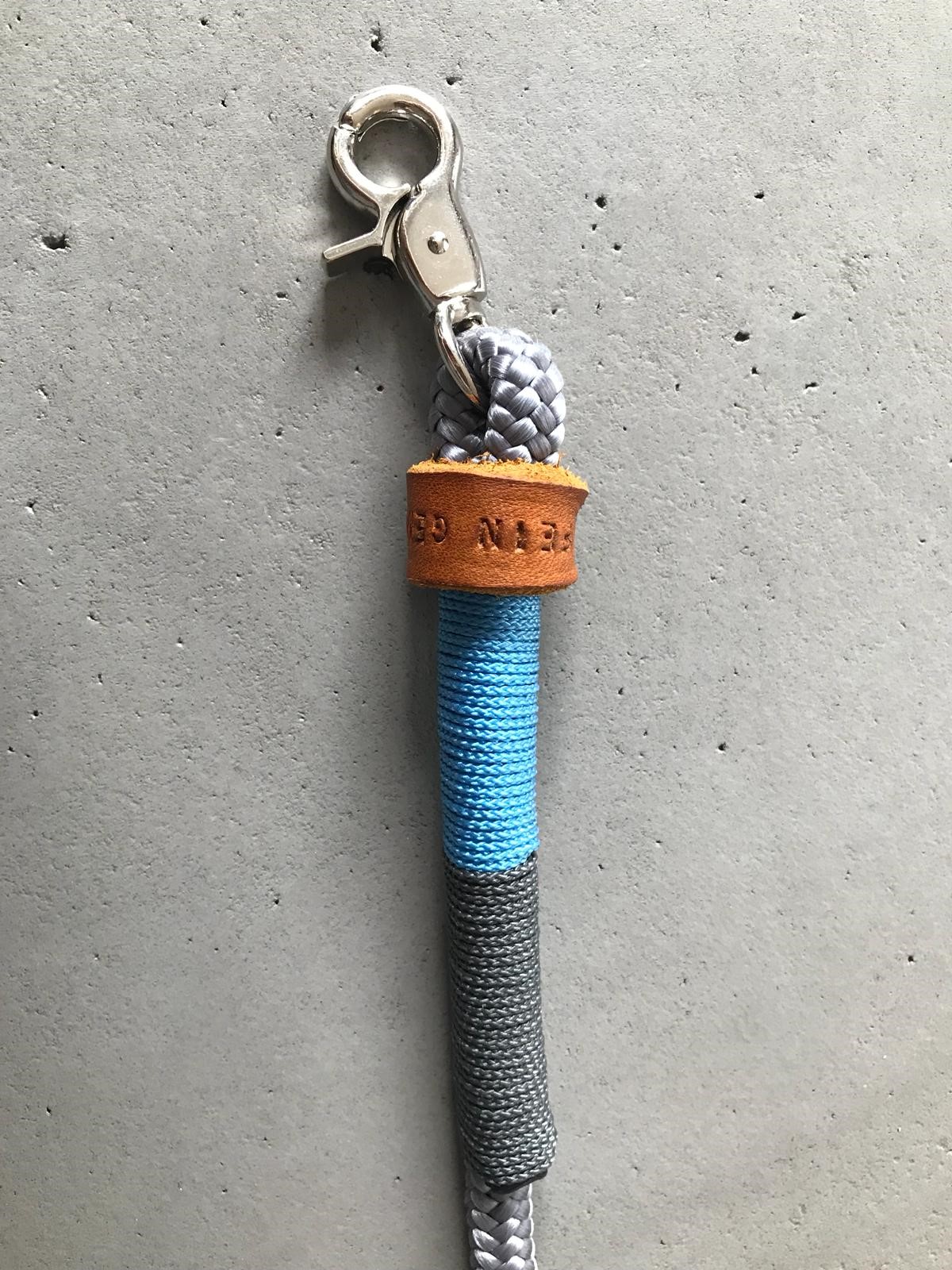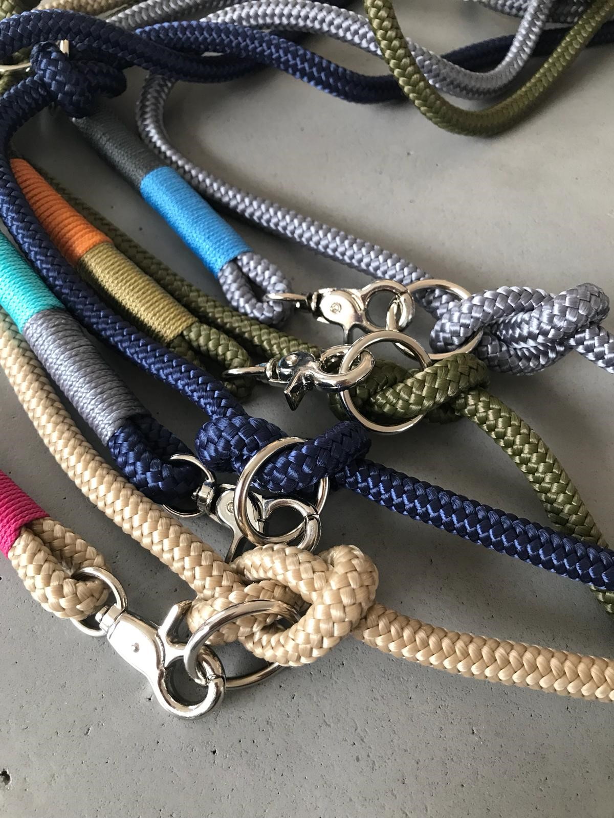 Die Leine besteht aus einem 8mm starken PPM Seil. Sie ist 2 Meter lang, 2-fach verstellbar mit passenden O-Ringen, hat 2 kleine Karabinerhaken und ist 2-farbig getakelt in den Farbkombinationen