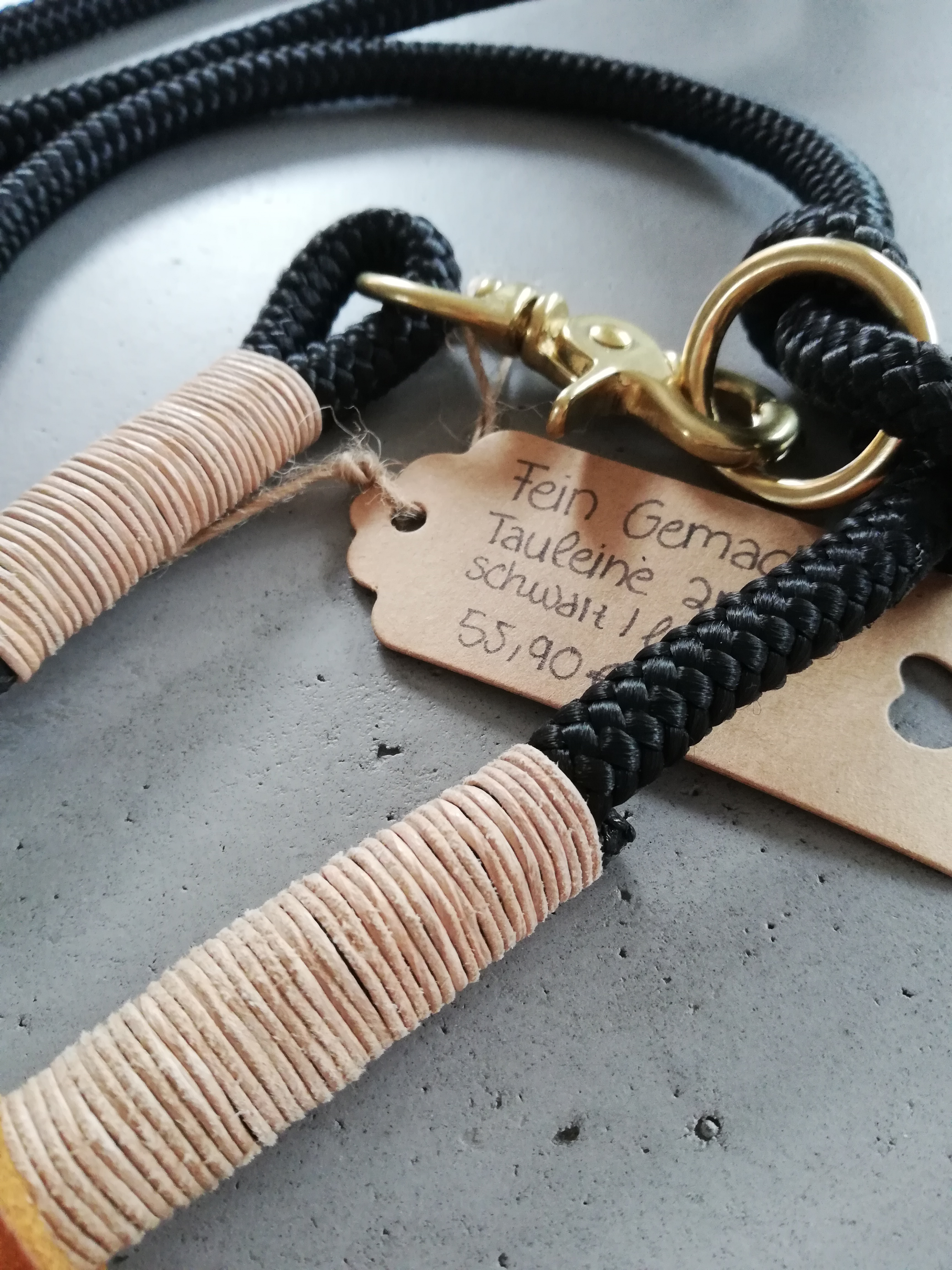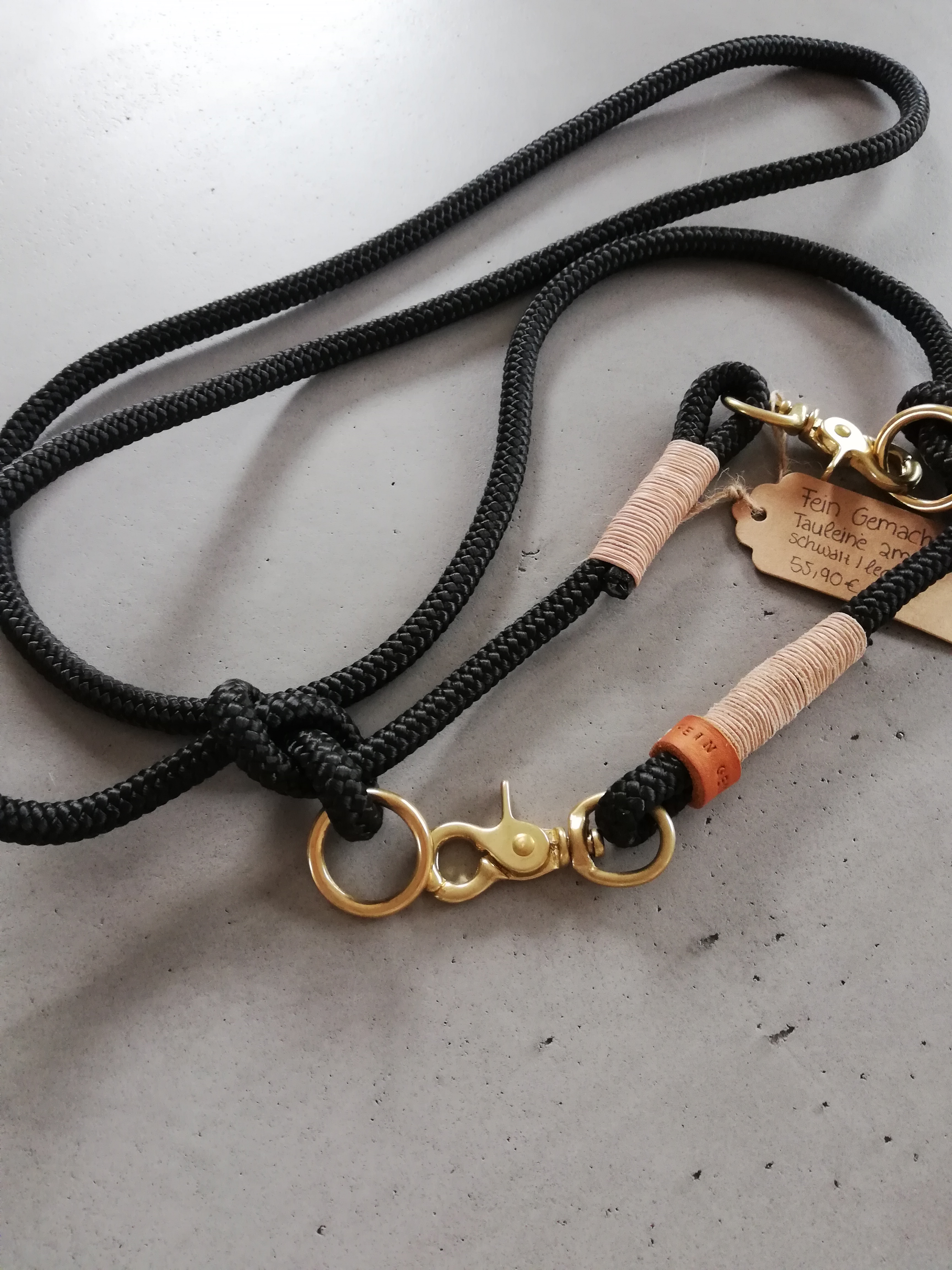 Diese schwarze Leine besteht aus einem 10mm starken PPM Seil. Sie ist 2 Meter lang, 2-fach verstellbar, hat jeweils 2 goldfarbige O-Ringe und Karabinerhaken und ist mit dünnem Leder getakelt.